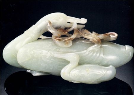 英国人伯纳德·桑利(Bernard Sunley)收藏了一对玉鸳鸯,其中一只身上刻有各种花卉,鸳鸯回头衔有一只如意,底部脚蹼雕刻得细致入微;另一只鸳鸯身边紧挨着一只小鸳鸯,母子情深。自古以来,鸳鸯在中国都代表着美好忠贞的爱情,这似乎也是桑利夫妇爱情的真实写照。