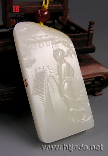 细雨绵绵,桃花争艳,春风又绿江南岸。一清丽婀娜女子提裙迈步,穿街款款而来。拾阶而上,越过石桥来到渡口。凝望远方江面波光飘渺,渡船摇橹穿梭,回首思绪万千。是思念远方的亲人?还是期盼有情人如约桃花岸边?楚楚动人、翘首企盼的神情令人顿生怜爱! 和田玉籽料方牌。玉质缜密细腻,纯净无杂,脂感浑厚,白度佳。工艺师以娴熟的技法在牌正面浮雕一端庄秀丽女子,正提衣携袖,侧身回首,衣带亦随身飘起,肩背部和腰身线条优美柔和,玉之温润脂白与人物相溶,浓浓的思念之情尽在那一回首中展现。身旁的石桥,桥面和桥洞在极小的高度上被刻画出立体层次,台阶由上而下,由深至浅,过渡自然。上部巧用天然撒金皮琢房檐屋舍上桃树花繁叶茂。牌背面沿边起线,额首为祥云,牌中刻诗词一首,字体苍劲有力。 作品构图富有层次,情景相融,工艺精湛,尤其对人物神情体态描绘得极细腻传神,在石桥空间立体把握上亦彰显其功力。跟脚处干净利落,打磨细腻入微,实属料工艺上乘之精品,颇值得收藏。 取自大块上等和田玉籽料原石,原料图中附有“小1”字样的为此款作品的原料图. 产品图一: 产品图二: 产品图三: 产品图四: 原料图一: 原料图二: 原料图三: 原料图四: