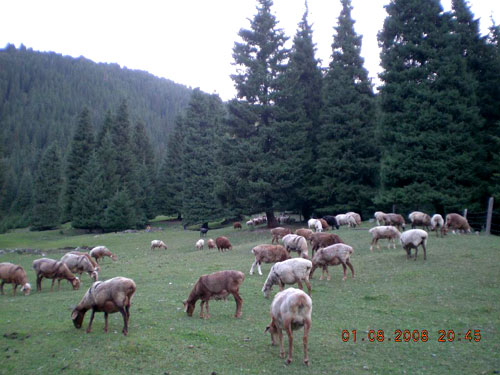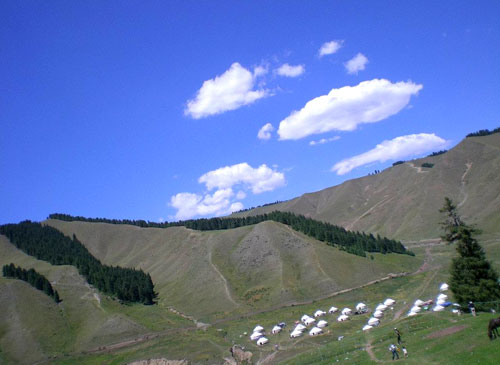 白天,躺在这个天然的牧场上,把心也放了羊,什么都可以想,什么也可以不想,眯眼轻睡,不时沙沙的风声传过来,风儿带着新鲜潮湿的空气,扑打着脸庞,开眼望天,满眼的蓝啊,那么清澈,几朵白云象海水卷起的浪花,轻薄纱似,怎一个美字了得!