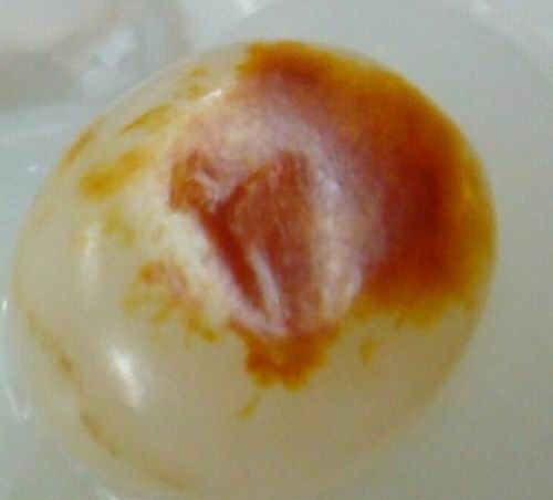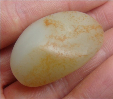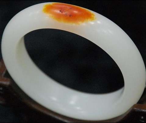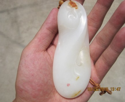 市场上除了青海料制作出来的高仿籽料.还有很大一部分是用俄山料制作出来的.辨别难度也相对来说高了一些.青海料大家大致的还能从玉质感觉上去辨别.因为大多数青海料的水头都很足.大家可以从水.透.上去辨别.而俄料就不同了.因为俄山料的有些品种在玉质感觉上与和田料差别不大.比如白皮料和灰皮料.上图是一块极品的白皮料染色的作品.玉质很好.染色者利用白皮量上薄薄的一层薄僵染色.染出来的色一般有一定的厚度.但是没有明显的过度色. 而且表面有被强酸腐蚀过的现象.