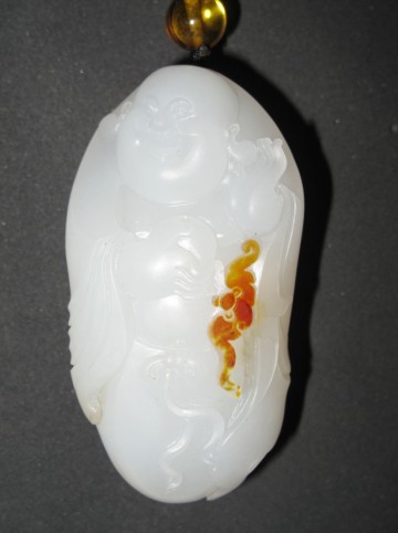 这个青海料是不错的东西,白度、润度都不错,工也好,水头也不是很过份,没有非常水透的感觉,对一些初级玉友来说,要分辨清楚也不容易。但这个皮色,我想一般人是能分清的,实在是太艳了,艳得让人受不了,这种东西就是点皮做上去的假皮色。有玉友会问:这种东西,我就看不出来皮色是假的,怎么办?一个简单的办法:看玉的边缘部位,比如说,您看一下这个佛举起来的左手的小拇指,从那里看,您应该是可以看出它的肉还是显得太过于水透、水嫩的感觉的,籽料的东西即使是做的很薄了也不会有太过水透或者干涩的感觉。如果您还看不出来,那您需要多看一看真籽的肉质,您就可以感觉它们之间的不同了。 其实对老手来说,看玉的时候,并不是仔细地翻过来覆过去地查看,见得多了,一眼就能看出来是什么料子,至少是可以感觉到某个东西值得怀疑的。比如说上面这个佛把件,如果让我来看:第一眼:假皮!第二眼:水嫩!心里就已经有一定的感觉了。然后再上手来看,打灯看,基本上不会上太大的当的。大多数的青海料,都是比较干涩的,但上面这两个料子的润度是不错的,所以也就有一定的迷惑性。