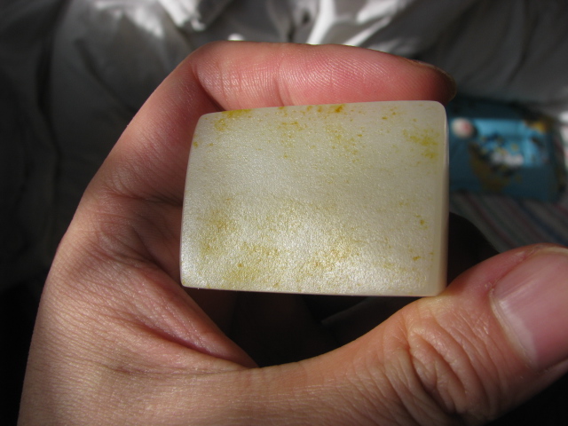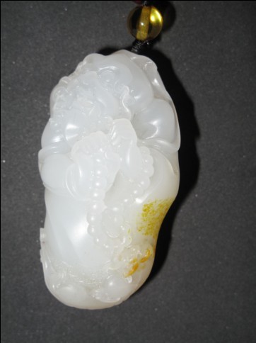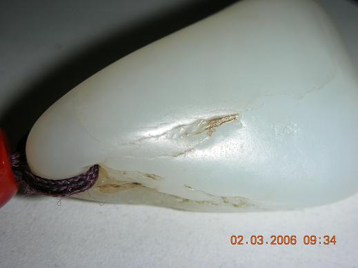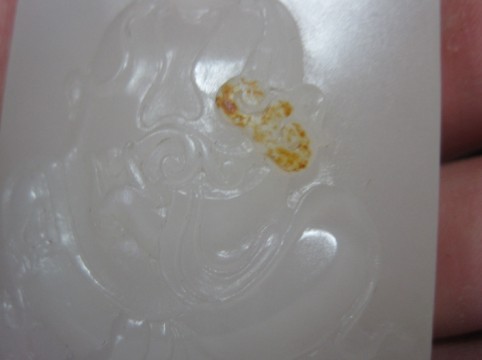 这个还是青海料的。料子很干涩,润度差,水透,从照片上都能感觉出来。如意上有“黄皮色”,皮色下还有明显的“毛孔”,仔细看皮色下颜色重的地方棉比较多,颜色浅的地方棉比较少,而且这样的东西还有人为的毛孔更加的提高了仿真度,这种毛孔一般是用雕刻工具里的金刚石尖针一个一个捣出来的.刻意的捣出深浅不一的感觉.然后用比较粗的油石打磨,出来以后会自然一点,但是与真的毛孔比还是有一定区别: