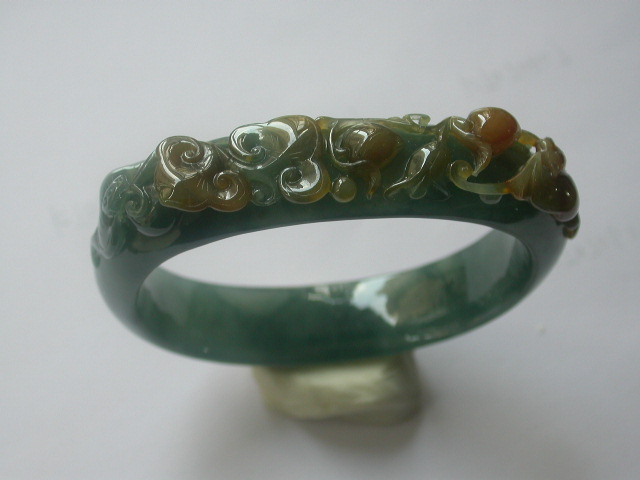 这个花样就多了,一般是为了一个镯子上出现多种颜色,但是玉种不算上乘,所以有工力的匠人就随俏色做出各种吉祥寓意,龙凤抢珠啦,连年有余(莲叶鲤鱼)啦,福在眼前啦(蝙蝠或蝴蝶和铜钱)啦,玉堂富贵(海棠牡丹)啦。