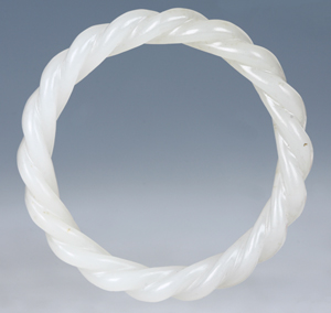 这种镯子一开始是仿的银镯里的麻花杆式样(大家都见过麻花吧),只是将福镯那样的圆镯表面刻成麻绳表面那样的纹路。后来苏工将这种镯子式样精益求精,把镯子的每一股都分开,但是都依顺序角度缠在一起——现在请大家拿出3-4根绳子,捋顺了拿住两段,平举胸前,然后左手朝自己的方向转,右手向外转,看下绳子呈现的状态,就是了。基本原理和扬工里的玉连环类似。
