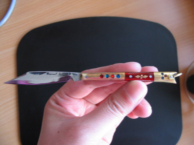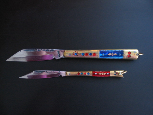 昨晚收到来自新疆的EMS 急匆匆打开 剥开粽子似的包装 哇 我一直都想要的来自玉龙喀什河的大石头终于到了 很漂亮的石头 颜色象刚出馕坑的馕 朋友说是象馕边儿的肉 哈哈 看 上面还粘着馕坑里的灰呢 冲洗干净 细细把玩一番 370克 手感很好 涂鸦时可以当镇纸 嘴谗时可以砸核桃 闲来无事用手掂掂还可以增加腕力 8错8错 嘎嘎 最好玩的是石头上方黑色的地方象一个蝙蝠 难道这就是传说中的"福从天降" 好玩 朋友说寄了一大一小2把小刀 遍寻不着 正疑惑呢 打开一个珠宝盒子 MY GOD 差点没晕倒 居然是2把小折刀 对按来说 实在是太小了点吧 笑的都岔气了 嘎嘎 小刀虽小 钢口不错 锋利异常 用来裁个信封啥的是不是有点浪费捏 嘎嘎 拍2张PP发上来玩 其余零碎的小玩意我自己留着美吧 哈哈 在此向帮我寻石找刀的新疆美女摔锅表示衷心的感谢 嘎嘎