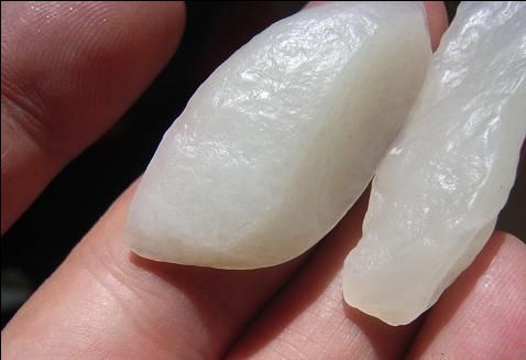 上图是窜浆的白色戈壁料子,僵点使得料子特别白。所以尤其使购买白料子的时候,要在合适(不强不弱)的光线下仔细观察。