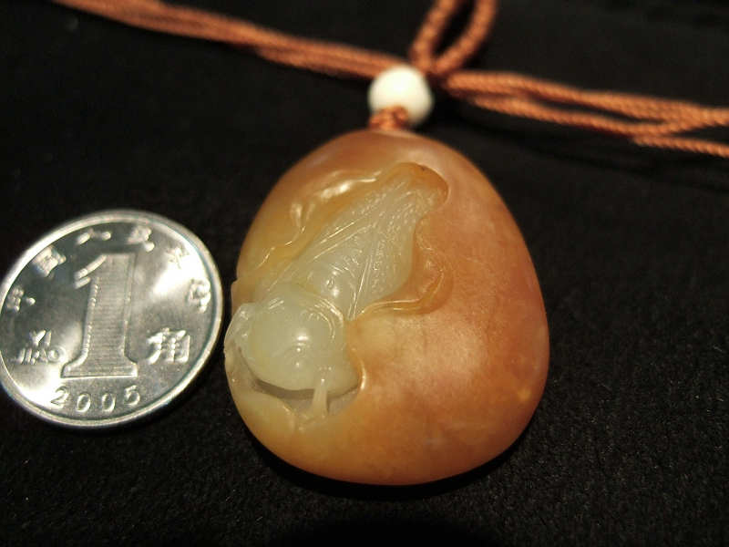 形很漂亮.整体的造型满可爱的,佩带起来应该还不错~~石性重了点,肉的白度还不错