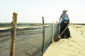 正午时分,特色种植区里上万名维族农民正热火朝天地为刚刚栽下的树苗安装防护篱笆,算上两个小时的时差,此时只相当于北京的上午10时。防护篱笆的材料是红柳树的树枝,这种树身材矮小但极耐干旱,沙漠中随处可见红柳树。做篱笆用的树枝一根根比拇指略粗,比树苗至少高一倍,经铁丝缠绕后串起,围成一个圆圈插入沙里,保护其中的小苗不受风沙摧残。