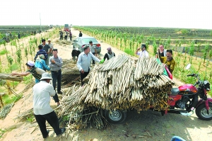 “村民开荒是没有任何报酬的,但是村里的干部一下去动员,大家都热烈响应。”陈远华也是援疆干部,对这里老百姓的质朴情怀充满感激,“跟他们接触的这些日子里,我感受到维族同胞一种发自内心地对树木的热爱、对耕地的热爱。一说要带着他们铲平沙漠,开荒种树,都高兴得不得了,根本没人对此讨价还价。”一位看上去有七八十岁的老爷爷,一手拄着拐杖,另一只手搂着一大捆红柳枝子,缓慢地从运输车走向“田”间,老人刻满岁月痕迹的脸上一直堆着微笑。