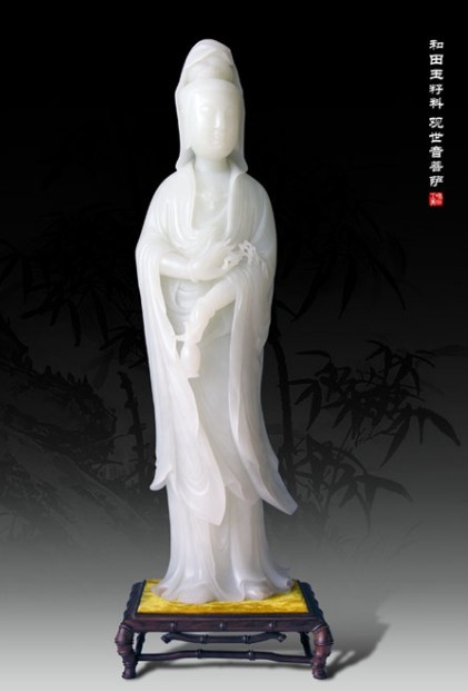 11.德王观音:趺坐岩石上,右手持绿叶一枝,左手置膝上。