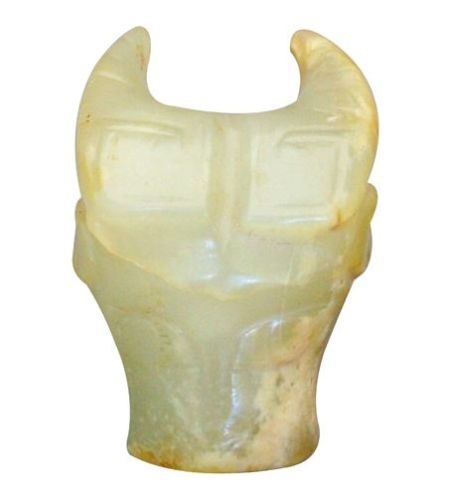 出土于虢国国君虢仲墓M2009。青玉,深豆青色。一对牛角呈弯月形,双耳呈凹面状,“臣”字眼,直鼻子微凸,阴线刻出牛嘴,口部有一圆穿。尾巴贴于两臀之间。