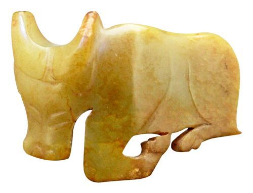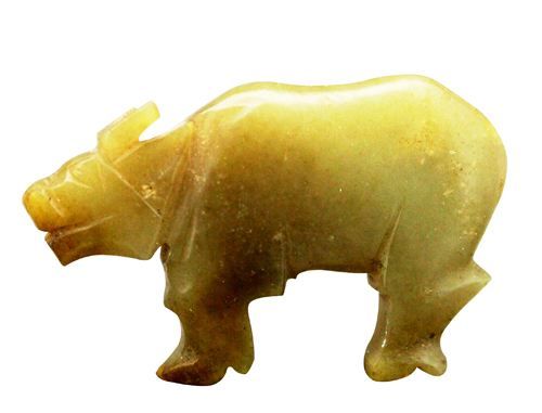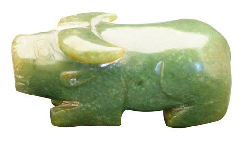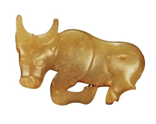 出土于虢国国君虢仲墓M2009。通高3.1厘米,身长4.2厘米,厚0.5厘米。青玉,浅豆青色,局部受沁,有黄褐色斑纹或斑点。其玉质细腻,微透明。做工甚为精细,以单面阴刻线勾勒出牛的两角、眼、鼻、肩、胸、颈等部位,前后肢收于腹下,背部隆起,头微低,双角耸立,“臣”字眼。口部有一圆形穿孔。
