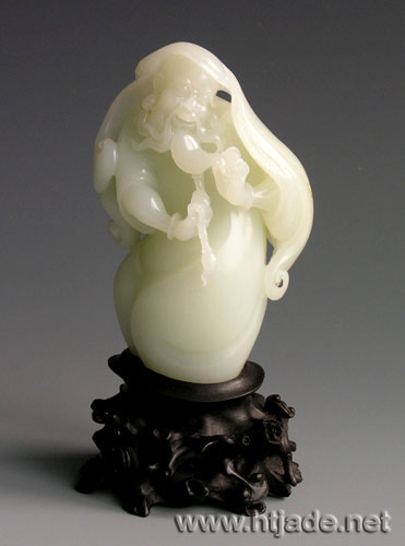 和田玉材质高贵,制作上艺术成分的比重很大,题材和表现手法必须变化多端。我问崔磊:“要想把每一块玉都找到它合适的模样,你要给它怎样的文化装扮呢?”崔磊谦虚地说:“千万别说是文化,有很多东西我说不出来,更多的是心理的感受,我经常走神,聊着聊着,对方的一句话、一个动作就可能给了我一个创作的灵感和题材,搞艺术创作的人更多是倾听、看,分享别人的观点和人生经历,从中找到创作的思路和头绪。”文化最昂贵之处是感受,看一件东西能在心里有所回馈,这是这件东西的价值所在,只不过是面对不同文化、不同层面的人感受不同。崔磊做的就是把他看到的人生悲喜、正反全放到作品里,见者各有所得,这也是他的作品被许多人喜爱的原因之一吧。