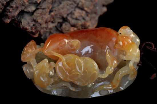 俏色雕是非常考究的一种雕刻手法,雕刻师需要巧用玉料的多种颜色,使不同的颜色恰到好处的分布在创意需要的部位,使作品有巧作天合之感。它就像是一幅立体的画卷,在颜色与形象的相互配合下营造出美妙绝伦的完美意境。绘画是在一张白纸上根据自己的想法用彩色的画笔描绘创意,玉雕却是根据玉料本身的特点,包括颜色分布、透明度、质地等思考创意,要做到恰当的运用玉料本身的颜色又要题材新颖、不落俗套达到天人合一的境界,创造出完美的作品着实不易。