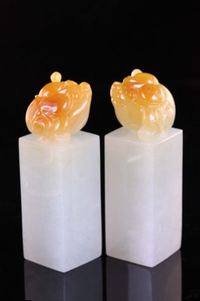 这对金蟾印章也是俏雕作品中一件非常不错的作品。翡翠本身冰种质地,细腻莹润,印章主题呈白色,其上是翡色金蟾,金蟾饱满圆润,体现了它只吃不吐的特点,有聚财纳福之意。雕刻师利用翠料的颜色分布,巧妙的将白色与翡色雕刻成印章和金蟾,玲珑可爱,妙趣横生。这件翡翠本身的原料要够大够厚才能雕刻出如此方方正正的印章造型,其难得程度可想而知。