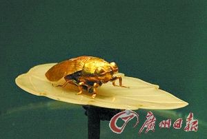 蝉又称“知了”,“知”谐音“枝”,金蝉玉叶也就是“金枝玉叶”。中国古代对女子的最高赞美莫过于“金枝玉叶”。而金蝉奏鸣,玉叶振动,正是金声玉振的艺术再现。