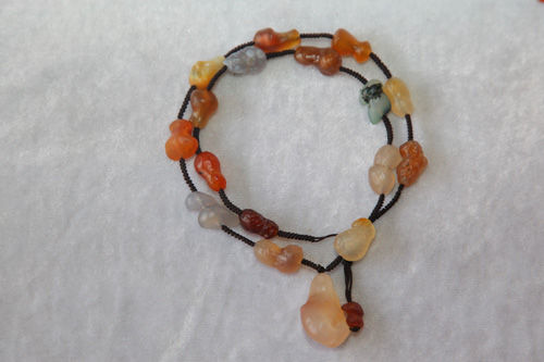 蔡小宁告诉笔者,阿拉善玛瑙相较于其他工艺品和文玩藏品的重要特点就在于纯天然的形状,以及并不光滑但却能展现出大自然“加工”风格的风化表皮;这也是其受到很多人喜欢的最重要原因之一。因此,以经营手串、项链为主的“悟石斋”,在位于北京的加工厂里对阿拉善玛瑙原石的加工,其实就是打孔和穿串儿,完全没有打磨、抛光等其它工序,从而最大限度地保留原石拙朴的自然韵味。不过,这并不代表制作一串具有收藏价值的优质珠串是很容易的,制作者需要在成千上万的原石中挑选出或大小、颜色、纹理统一的,或每一颗的颜色都不同的,或有着独特形状的原石搭配成手串或项链,需要很大的耐心和丰富的想象力。