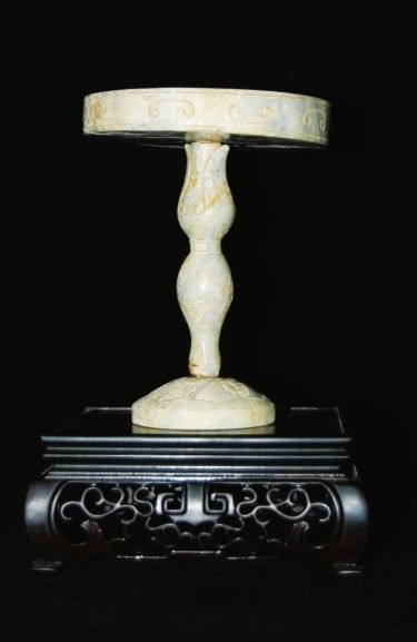 汉代玉灯——存世量极其稀少,故宫博物馆只有一件是战国的,此件稍晚几百年,但能收藏到已属不易。灯由三个玉件组合而成,分灯座、灯杆、灯盘,灯座雕刻柿蔕纹,灯杆雕刻成一根花杆儿,灯盘就好像是从花杆里长出来的一只盛开的花朵。此主题相关图片如下: