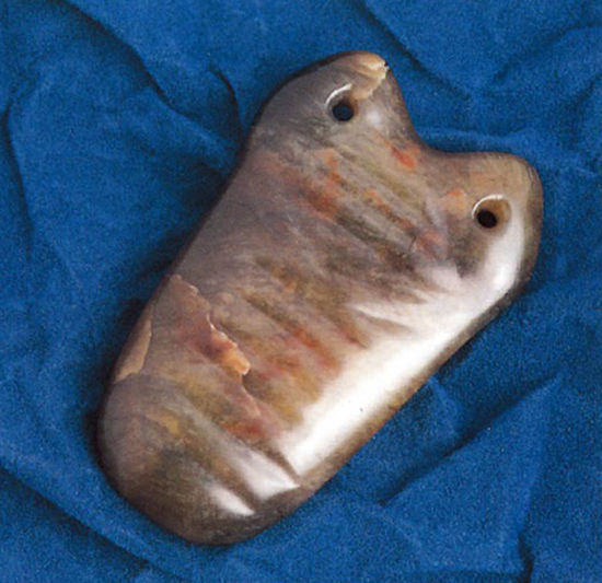 以“佩蝉”而言,就笔者所知,新石器时代红山文化与良渚文化时期已出现。张陵山出土者,形近三角状,平底凸面,阴纹刻画,尾钻三孔,应作佩繫之用。浙江出土者,也是良渚文化时期玉蝉,形似细长六边形,上方两边琢二眼孔,亦应为佩饰。另见一件红山文化丫形玉器(见附图),上有二孔,供佩繫;有天然色沁,刻纹简朴,乃属蝉形,也可能是人面蝉形合成一体,尚待细究。