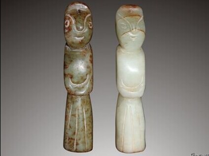 玉翁仲在汉代比较流行,是一种使用配饰。此玉翁仲为一对,高7.2cm,采用汉代风格“汉八刀”的雕琢方法,玉料分为深青色和乳白色,局部有花白色和黄色沁斑,体扁长,为半圆雕。两翁仲形象相同,造型简单,头顶有长发髻,脸长,以阴刻线饰双目和口,其色苍古,面部只琢眼和口,仅用三至五刀短阴线雕成,呈倒“品”字形,睑为长圆形,玉翁仲的颈部和腰下都用撤刀法,使颈部和腰下部出现平塌,呈三角形斜平面,这样使头部更为明显,腰部有轮廓感,服装下摆呈鸡笼状,这是汉代翁仲的风格特征,此玉翁仲无胡须,采用汉代风格“汉八刀”的雕琢方法。