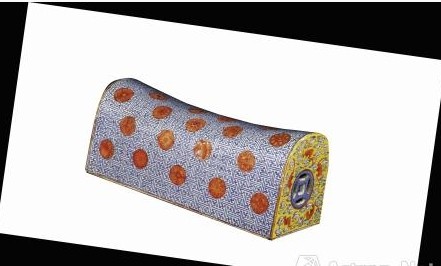 这是一件清代的粉彩幅钱矾红料釉瓷枕,长形腹空,下端平整,上部中间微凹两端翘起,形似马鞍。瓷枕两侧平面,充满吉祥意味的黄色底色上饰以红、白、蓝相间的纹饰,中间位置相对开有古钱孔用以出气通风,亦是为了防止烧造时发生炸裂。矾红釉又名铁红釉,是在氧化气氛中烧制而成的低温红釉,创烧于明代嘉靖年间,到了清代康熙时期烧制工艺有了很大的进步,色泽鲜艳,呈色稳定。整件器物形态端庄,色彩明艳、斑斓,用色吉祥、丰富,枕面上遍布规整有致的几何形图案,纹饰细腻,结构协调,特别是锦地上点缀的32个幅钱矾红料吉祥图案,衬托得器物主次分明,图案中的花卉、禽鸟等内容丰富,寓意美好。