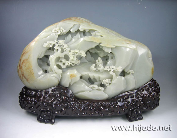 玉器的圆雕山林景观就是玉山子,玉山子上分别雕出山林、人物、动物、飞鸟、流水等,层次分明,各具形态,这种山林景观的雕刻,从取景、布局,到层次排列都表现和渗透着绘画的章法。