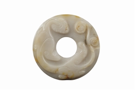 玛瑙璧(图2),元代装饰品,直径7.5厘米,厚2.3厘米,璧的一面为平面,另一面微凸,上面浮雕一条螭龙,螭龙躯体细长,作爬行状,螭身随璧弯曲,翻转自如,螭龙形玉雕躯干细长,动势起伏大,生动富有神采,为元代极为少见的玛瑙装饰品。